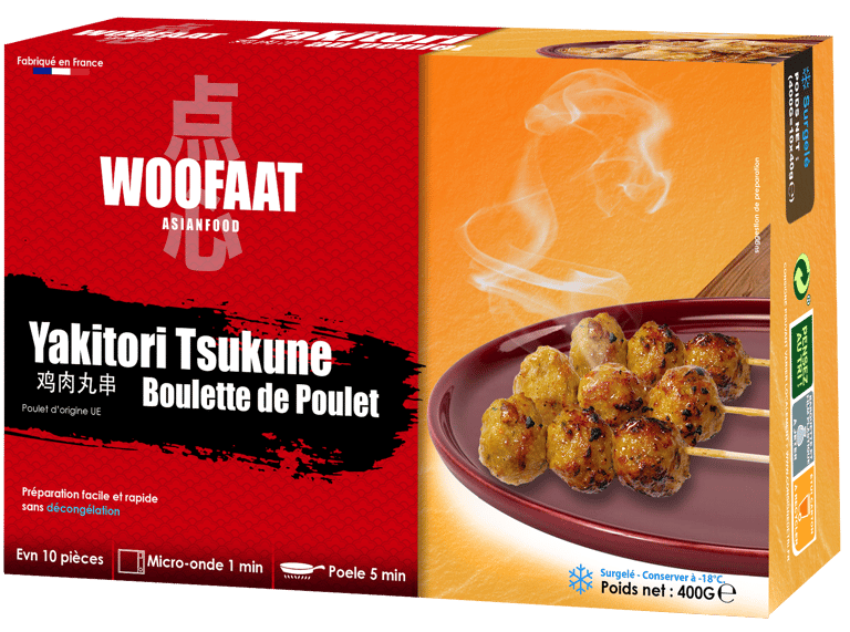 INGRÉDIENTS : Haut de cuisse de poulet (74%), oignon frais, sauce soja (eau, graine de soja, blé, sel, dextrose), eau, ciboulette, chapelure, sauce mirin sans alcool (Riz gluant, eau, koji (riz fermenté), glucose, acide acétique (E260), acide citrique (E330), acide malique (E296), sorbate de potassium (E202), soja, stabilisant E451, E450, épaississant E460, régulateur d’acidité E262), poudre de gingembre, poivre, sel